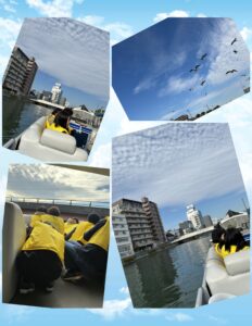 「ひょうたん島」クルーズでは、青空の広がる好天にも恵まれ、県都の中心を流れる「新町川」をボートに乗って遊覧しました。
